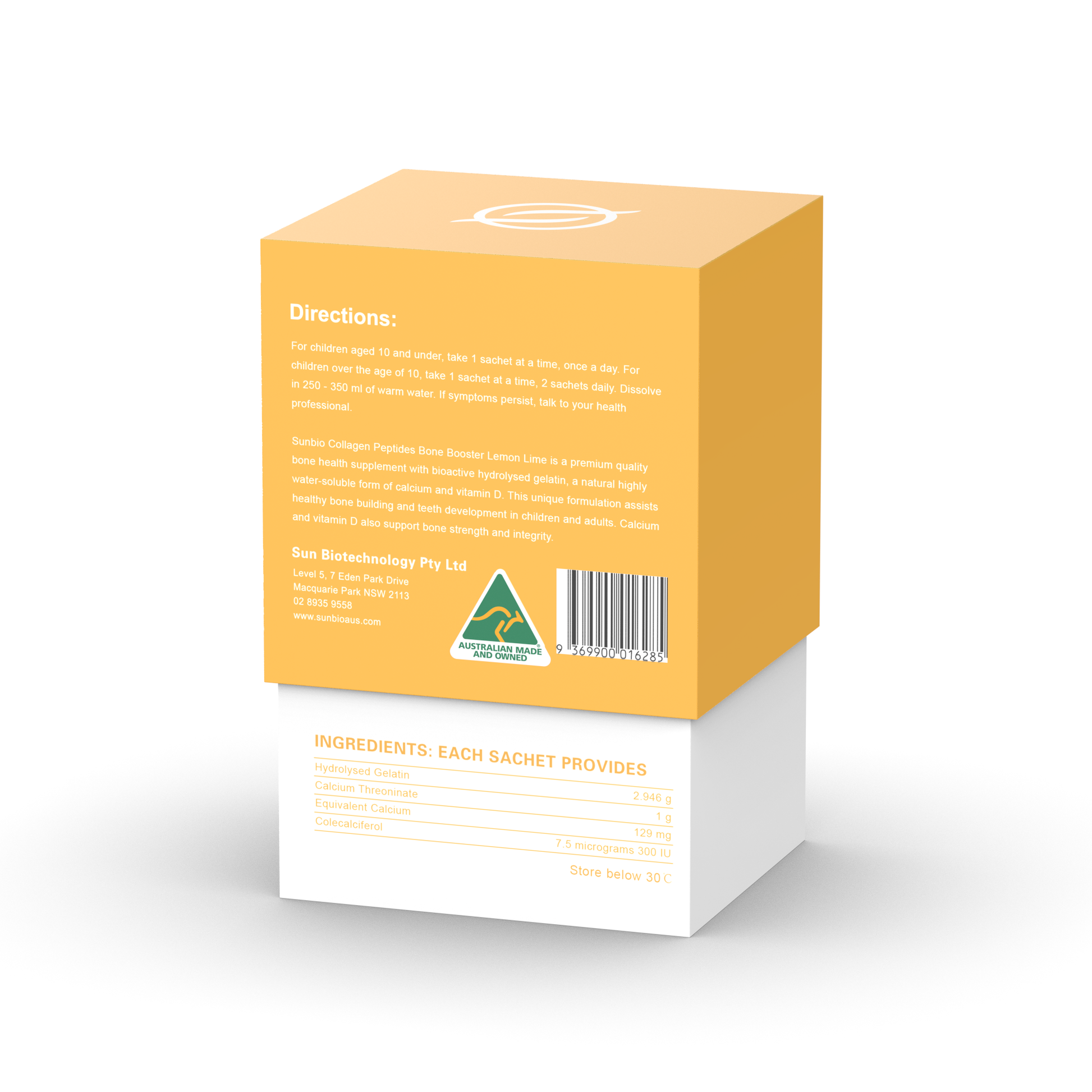 Our Collagen Peptides Bone Booster is a premium quality bone health supplement with bioactive hydrolysed collagen, a natural highly water-soluble form a calcium and vitamin d. This unique formulation assists healthy bone and teeth development in children and adults. Supports Immune System Health. Each sachet also contains calcium and vitamin D, which supports bone strength and integrity.